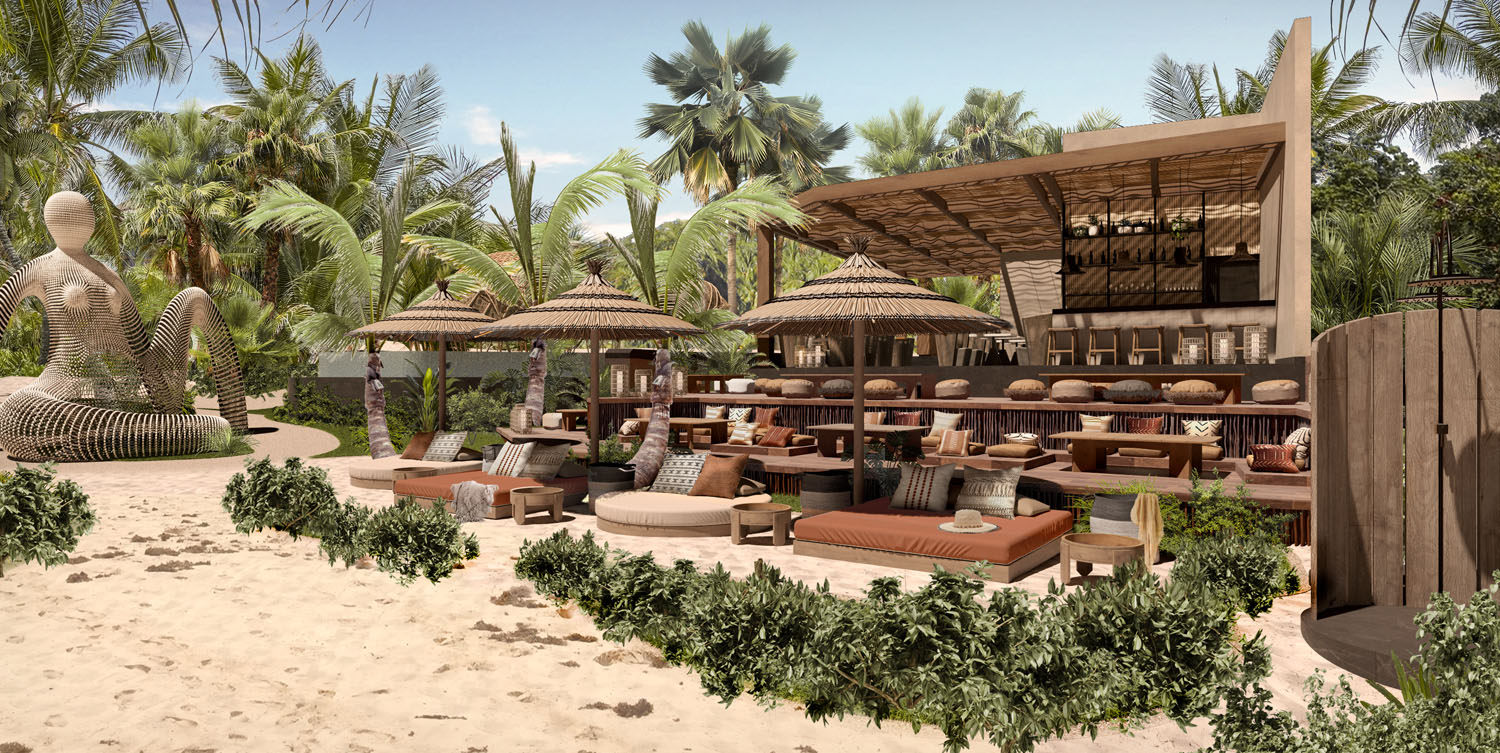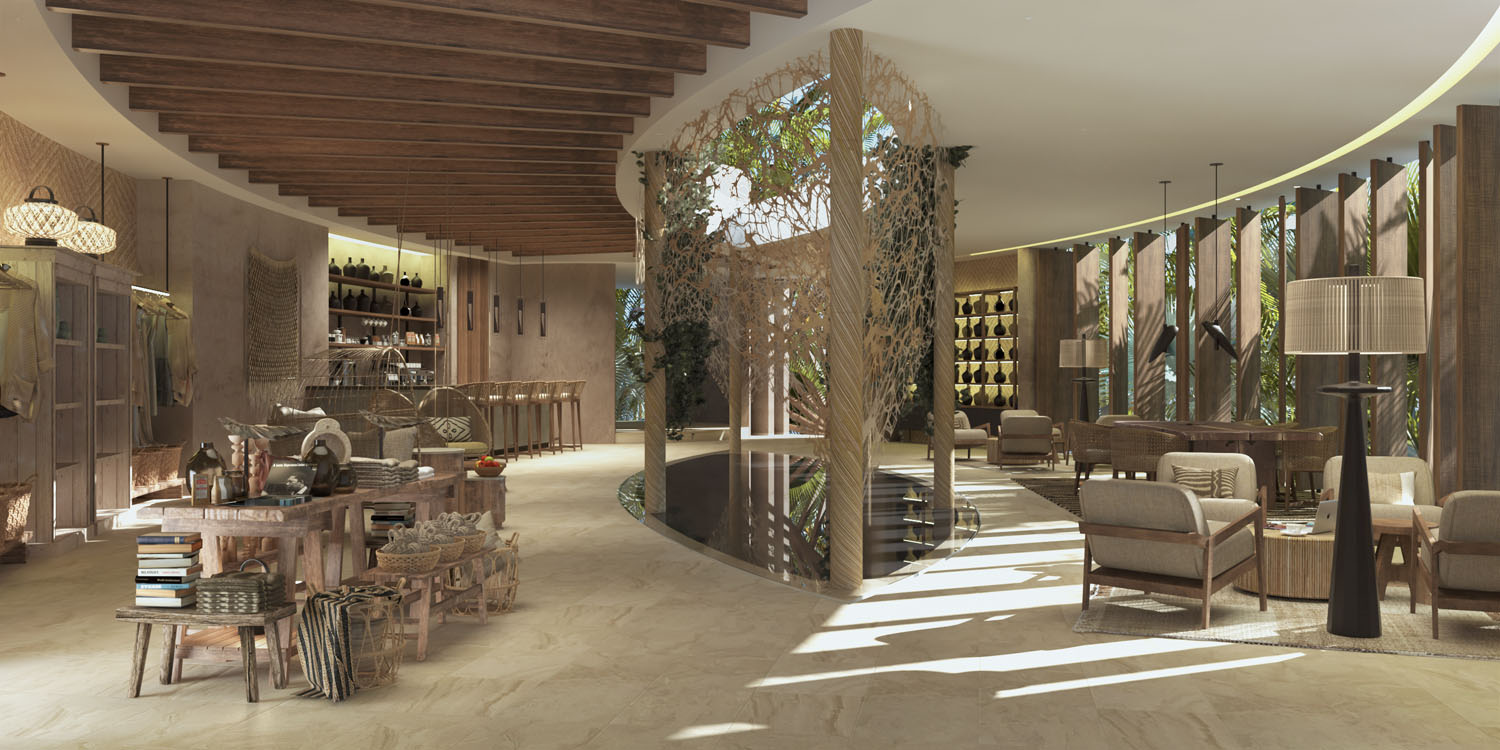 La icónica entrada al hotel es una escultura interactiva, busca resaltar el ritual que cada noche ofrece el cielo de Tulum y el diseño propuesto permite que el visitante se vuelva el principal protagonista y observador de este espectáculo natural.