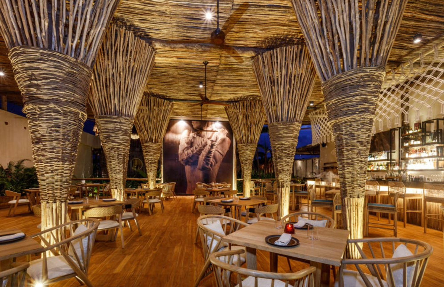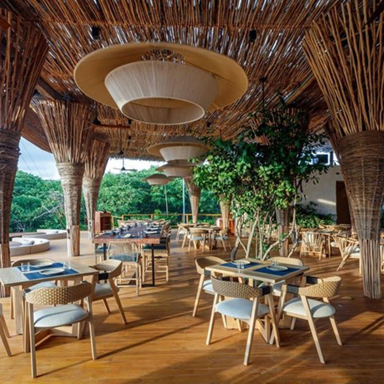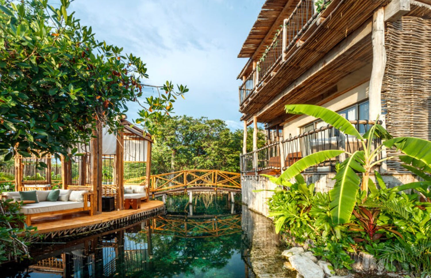 La arquitectura del hotel se funde a la perfección con la naturaleza que lo rodea. 64 villas al aire libre elevadas sobre una estructura de madera cubierta por techos de paja y amplios ventanales que ofrecen vistas panorámicas hacia el manglar y cuerpos de agua que refrescan el ambiente.